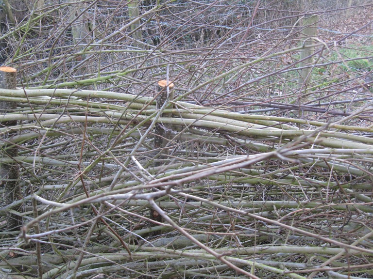 Over recent weeks there has been much wielding of billhooks by certain members of our household as some very old and straggly hedges have been laid in the traditional manner. It is very satisfying to see a hedgerow all neatly laid with neat cuts (pleachers) open to the sunshine ready for new growth as soon as the sap starts to rises in spring. The finishing touch to the perfect hedge is the bindings – the sue of long lengths of material woven along the top of the hedge t hold if firmly in place helping to make it stock proof until the hedge regenerates. I read recently that this was traditionally done with long lengths of bramble (with thorns removed) which shows just how our predecessors made use of every bit of material.